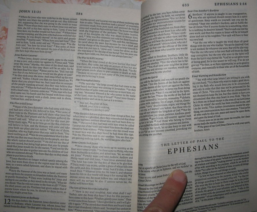 This particular printing (printed in Canada) appears to have suffered a quire selection problem. There are two copies of Matthew 22:4 to John 12:30. From the second copy of John 12:30 we continue suddenly at Galatians 5:4. Reading over the page boundary it says (bizarrely):